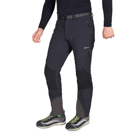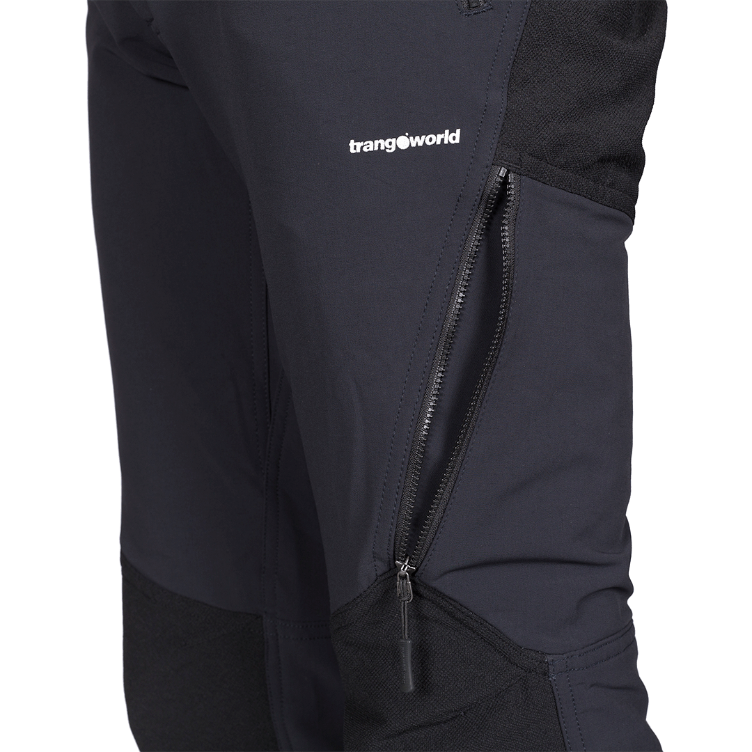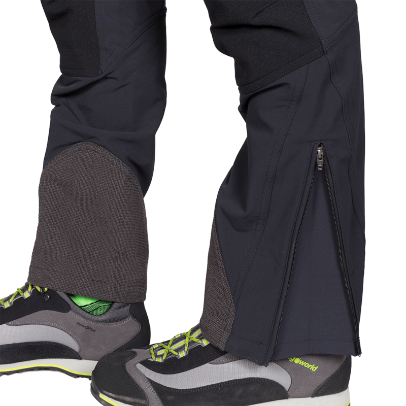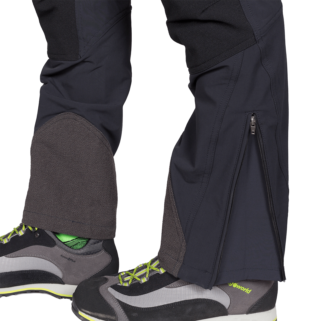 Pantalon homme automne-hiver en tissu Cordura élastique, avec ouverture zippée en bas, renfort Kevlar sur la cheville interne et renforts sur l'assise et les genoux. Poches arrière et latérales avec fermeture éclair.